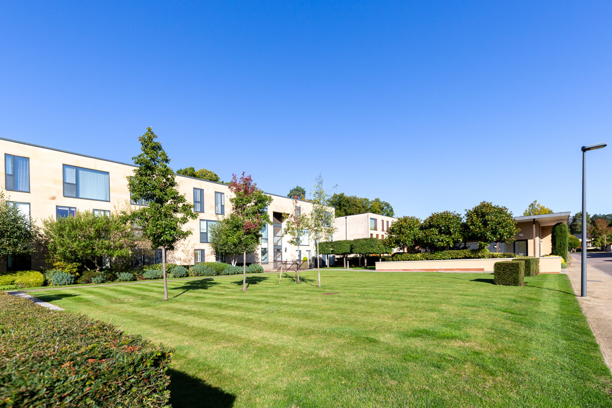 View of beautifully clipped and shaped hedges and shrubs in grounds of retirement home